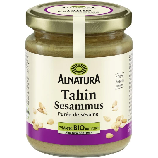 Ein aromatisch-nussiges Tahin, welches zu hundert Prozent aus Sesam gewonnen wird. Es verfeinert Dips sowie Saucen und verleiht pikanten Gerichten eine orientalische Note. Auf den Zusatz von Stabilisatoren wird verzichtet, sodass sich sesameigenes Öl absetzen kann durch Umrühren wird das Mus wieder cremig. Das Alnatura Tahin ist ungesalzen und wird aus Bio-Sesam hergestellt.