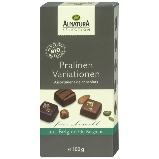 Haselnuss-Praliné, Karamellcreme, Mokka-Nougat, Zartbitter-Nougat, Mandel-Nougat mit Pistazien fünf verschiedene Sorten belgischer Bio-Pralinen ideal als Geschenk oder für die besondere Kaffeetafel.